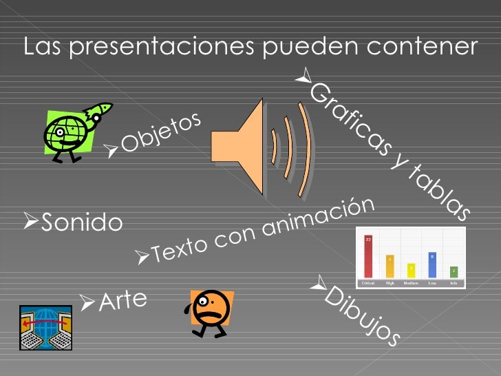 Con PowerPoint podemos crear presentaciones de forma fácil y rápida pero con gran calidad ya que incorpora gran cantidad de herramientas que nos permiten personalizar hasta el último detalle. Podemos controlar el estilo de los textos y de los párrafos, insertar gráficos, dibujos, imágenes... También es posible insertar efectos animados, películas y sonidos.